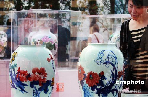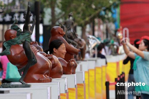 9月22日,奥林匹克艺术品亮相北京王府井大街,参观游客络绎不绝。 中新社发 郑雄增 摄