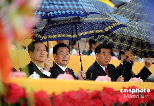 9月23日上午,干旱少雨的银川降下甘露,宁夏回族自治区成立50周年庆祝大会在银川览山剧场隆重召开,中共中央政治局常委、中央纪委书记贺国强率中央代表团出席。中新社发 廖攀 摄