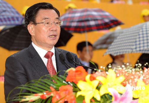 中央代表团团长、中共中央政治局常委、中央纪委书记贺国强在大会上作重要讲话。中新社发 廖攀 摄