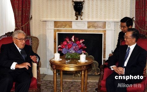 中国总理温家宝23日在纽约会见美国前国务卿基辛格。中新社发 李静 摄