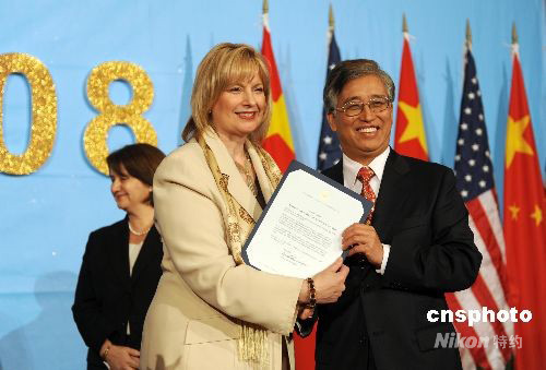 图为加州州长代表向中国驻洛杉矶总领事张云递交加州州长施瓦辛格的祝贺信,施瓦辛格在信中感谢华人华侨为加州做出的贡献,并向他们致以国庆祝贺。中新社发 张炜 摄