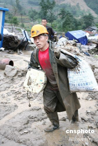 四川地震灾区北川羌族自治县连降暴雨,遭泥石流袭击,一批基础设施被毁。图为24日上午,擂鼓镇麻柳湾村村民正在转移。中新社发 蒲滔 摄