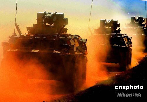 9月25日上午,中国人民解放军“砺兵--2008”演习在塞北大漠展开。这场演习是一场在复杂地形、复杂电磁环境、作战信息“背靠背”情况下,跨军区联合、多兵种协同、陆航空一体、实兵检验性战术集团立体机动攻防战斗演习。中新社发 宋吉河 摄