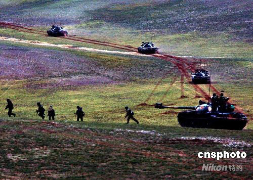 9月25日上午,中国人民解放军“砺兵--2008”演习在塞北大漠展开。这场演习是一场在复杂地形、复杂电磁环境、作战信息“背靠背”情况下,跨军区联合、多兵种协同、陆航空一体、实兵检验性战术集团立体机动攻防战斗演习。中新社发 宋吉河 摄