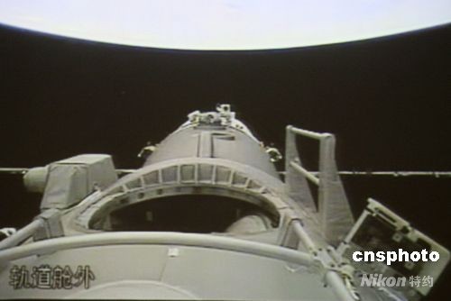 北京时间九月二十七日下午四点五十九分,神舟七号航天员翟志刚成功出舱,实现中国历史上第一次太空行走。图为神舟七号轨道舱门打开的瞬间(摄于北京航天飞控中心大屏幕)。中新社发 齐彬 摄