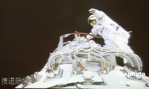 北京时间九月二十七日下午四点五十九分,神舟七号航天员翟志刚成功出舱,实现中国历史上第一次太空行走。图为摄于北京航天飞控中心大屏幕的在太空中的翟志刚。中新社发 齐彬 摄