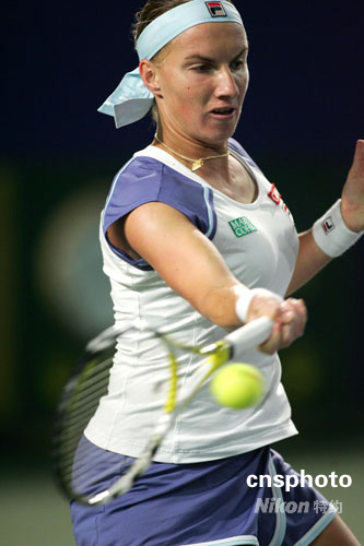 4号种子俄罗斯姑娘库兹涅佐娃对阵中国金花郑洁,最终库兹涅佐娃以7-6/7-5战胜郑洁挺进决赛。中新社发 富田 摄