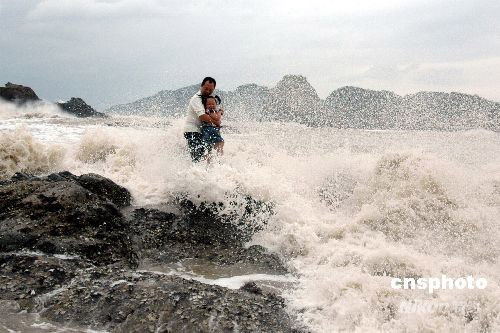 9月28日,受超强台风“蔷薇”影响,浙江温州市洞头岛海域已是波涛汹涌,海礁上掀起的巨浪高达10多米。下午2时许,一对外地父女在海边游玩时不慎被突涨的潮水困在礁石上,随时可能被海浪吞噬。正在海边巡逻的洞头边防大队官兵发现险情后,迅速展开紧急营救,成功将父女从海浪中安全救上岸。中新社发 吴水斌 摄