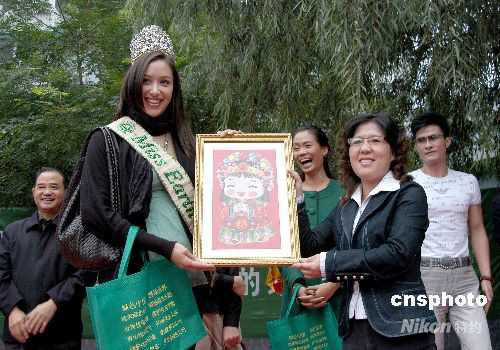 2008年10月6日下午,来自加拿大的“世界绿色环境大使”、2007“地球小姐”世界冠军杰西卡和来自菲律宾的“世界绿色环境大使”、2006“地球小姐”季军凯瑟琳及参加“地球小姐”世界绿色环保大赛中国总决赛的全国40位优秀的“绿色天使”,来到南京绿色环保示范社区南湖沿河社区,向社区居民宣传环保知识并发放环保袋和无磷洗衣粉,受到社区居民的欢迎。中新社发 刘建民 摄
