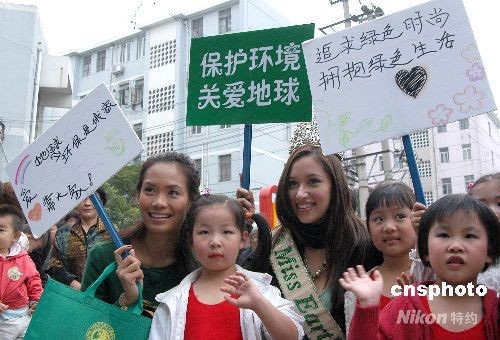 2007地球小姐世界冠军杰西卡(中)、2006地球小姐季军凯瑟琳与社区的孩子们在一起。 中新社发 刘建民 摄