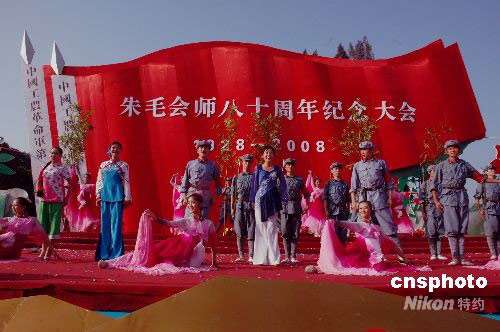 十月七日,八十年前朱德领导的南昌八一起义部队与毛泽东领导的秋收起义部队会师纪念大会,在井冈山龙市朱毛会师广场隆重举行。纪念大会现场热闹非凡,鞭炮、锣鼓、彩旗让八十年前热闹喜庆的场面重现。中新社发 段长征 摄