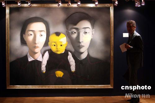 十月八日,香港佳士得推出一批即将在秋季拍卖的顶级当代艺术品,总值约四千万港元,其中还有著名好莱坞导演奥利弗·史东(Oliver Stono)私人收藏的张晓刚油画作品《血缘:大家庭之二》。佳士得表示,该艺术品没有估价,届时将由买家出价,价高者得。中新社发 洪少葵 摄