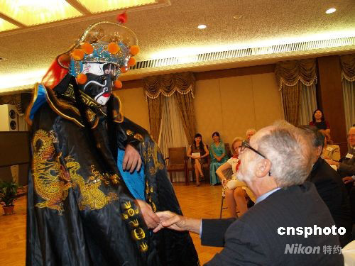 当地时间10月8日,中国驻洛杉矶总领馆举行“纪念中美建交30周年茶话会”,洛杉矶世界事务委员会的美国朋友约一百多人参加了茶话会,共同畅谈中美建交30年来的友谊。旅美京剧演员刘小任表演“变脸”,赢得满堂喝彩。 中新社发 卢威 摄