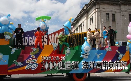 图为台湾高雄市布置的花车在为二00九年举办的世运会做宣传。中新社发 耿军 摄