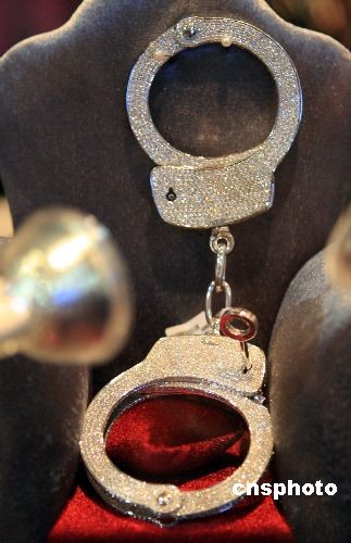 10月10日,一付价格为12万美元、由钻石、白金精致铸造的手铐,亮相上海富世峰会,这种另类的奢侈藏品,让参观者不得不探究其中的另类品味。中新社发 潘索菲 摄