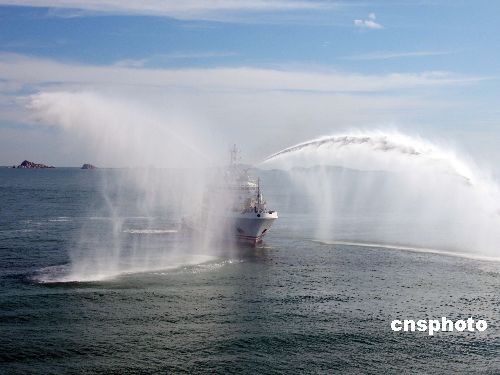 图为救助船舶开启消防炮和水幕,协助遇险客滚船外围灭火。
