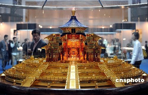 十月十四日,镶有约20万粒宝石的“天坛祈年殿”工艺品引人注目。这件作品高1.38米,重2.5吨,以金银、宝石等材料制成。当日,中国传统工艺美术精品大展在北京民族文化宫举行,该展集中展现了改革开放以来中国工艺美术三十年发展成就。中新社发 廖攀 摄