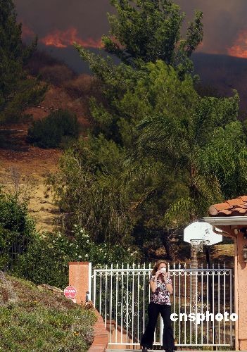 山林大火正逼近洛杉矶近郊的民宅,房屋主人焦急万分,几分钟后,她不得不撤离家园。中新社发 张炜 摄