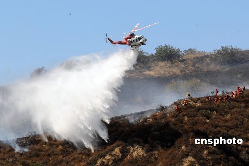 一架消防直升机在洛杉矶附近的山火现场实施空中灭火。中新社发 张炜 摄