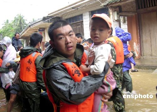 海南文昌遭受连续三天的暴雨袭击,全县多处遇险,其中两名村民遇难。文昌部队官兵全部出动,协助当地政府抗洪救灾,转移群众,搬运物资。中新社发 蒋第二 摄