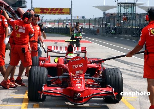 10月17日上午,2008世界一级方程式锦标赛第17站中国站的比赛在上海国际赛车场开始进行第一次自由练习赛,目前在车队积分榜上领跑的法拉利车队多次演练赛中加油。在新加坡赛站发生严重的“加油事故”后,法拉利车队恢复了传统的“棒棒糖”指挥车手的方法。中新社发 任晨鸣 摄