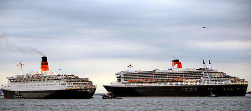 10月16日,巨型邮轮“伊丽莎白女王二号”(左)与“玛丽女王二号”在美国纽约港相会。当天,这两艘豪华邮轮在纽约港会合,随后一起驶回伦敦。已运营逾40年的豪华邮轮“伊丽莎白女王二号”将在这次航行之后退役,然后被改造成一座水上五星级酒店,停靠在阿联酋迪拜的朱迈拉棕榈岛旁。