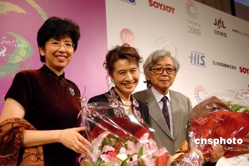 图为在晚上举行的开幕酒会上,中国广电总局副局长赵实向日本著名导演山田洋次(右)、著名演员栗原小卷(中)颁发“中日文化交流促进奖”,以感谢他们多年来为中日文化交流所作出的巨大贡献。中新社发 朱沿华 摄