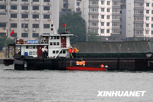 10月20日,广西迄今最大规模内河水上搜救演习在柳州市柳江河段举行。图为演习船舶发生碰撞造成船上硫酸及燃油泄漏,救援人员登上失事船舶实施救助。新华社记者 黎蕊 摄
