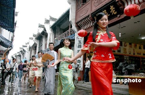 2008年10月22日,黄山魅力青年在屯溪老街举行风情模特秀。安徽黄山市为提升城市品位,充分展示黄山青年的良好形象,黄山魅力青年首次在千年古镇的屯溪老街举行风情模特秀。魅力青年模特在古色古香、徽风遗韵的屯溪老街“秀”出了风情万种、人与自然和谐共存的美好景象。中新社发 方也广德 摄