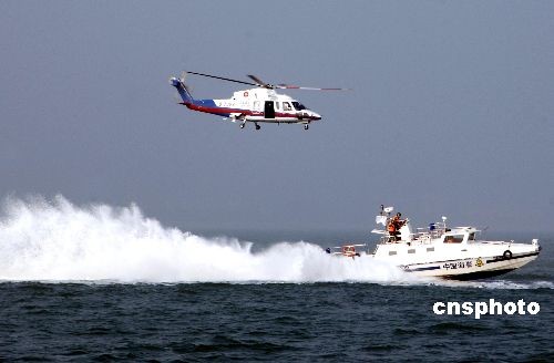 10月23日下午,厦金航线海上搜救演习在厦门湾水域举行,海峡两岸共出动25艘船舶、16艘辅助船舶以及两艘直升机参与演习。演习的目的是为了检验两岸直航航线搜救应急预案的科学性和可操作性,检阅实际搜救指挥协调能力和搜救成效,以更好地保障厦金航线海上运输和海上作业安全。图为直升机和海上救助船舶进行救人演练。中新社发 王东明 摄