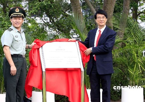 十月二十四日,中国人民解放军驻港部队八十位官兵访问香港科技大学。图为驻港部队副司令董文久与香港科技大学校长朱经武在科技大学草坪主持植树纪念及牌匾揭幕仪式。中新社发 张勤 摄