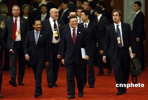 欧盟委员会主席巴罗佐(中)出席会议。中新社发 盛佳鹏 摄