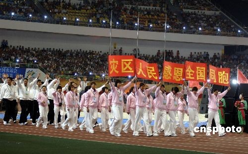 开幕式上,四川代表团进场时高举“灾区人民感恩全国同胞”的横幅,激起全场热烈掌声。中新社发 王东明 摄