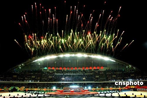 灿烂的烟花点亮体育中心。中新社发 郑祚声 摄