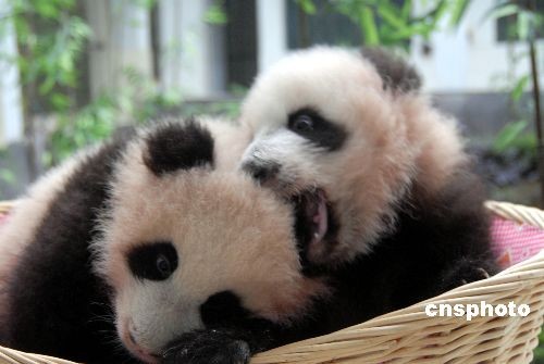 5.12汶川大地震发生时,大熊猫“帼帼”已经怀孕110余天,5月24日“帼帼”被安全转移至碧峰峡基地,7月6日“帼帼”顺利产下一对龙凤胎。这对龙凤胎大熊猫成为2008年出生的全球首对大熊猫双胞胎。为给这对不平凡的熊猫宝宝取一个有意义的名字,中国保护大熊猫研究中心联合网络媒体一起发起 “2008全球首对大熊猫双胞胎征名活动”。10月下旬,中国保护大熊猫研究中心雅安碧峰峡基地歌声飞扬——2008年全球首对大熊猫双胞胎百日庆典活动隆重举行;同时大熊猫研究中心向全球公布了网上投票选出的 “平平”“安安”两个熊猫幼仔乳名。中新社发 罗小韵 摄