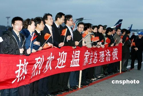 中国国务院总理温家宝27日晚乘专机抵达俄罗斯首都莫斯科,开始对俄罗斯进行正式访问,并参加中俄总理第十三次定期会晤。温家宝在机场受到俄副外长博罗达夫金等俄方官员的热情迎接并出席了欢迎仪式。中新社发 田冰 摄