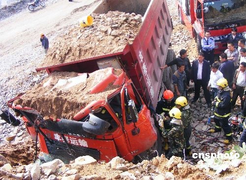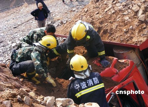 10月27日9时,浙江省宁波慈城镇黄山村上演惊人一幕:一辆满载石块车牌为皖N60589的大卡车因为制动失灵,在近50度的山路陡坡上演飘移,撞向山路上的悬崖峭壁,导致山体局部塌方,整个车身被滚落的山石掩埋。消防部门接警后第一时间赶往现场,成功将被困司机救出。中新社发 何蒋勇 摄