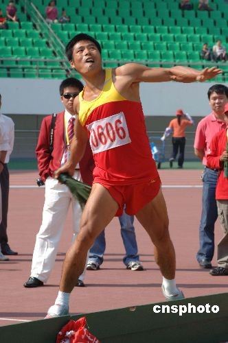 十月二十八日,在福建泉州市海峡体育中心体育场内举行的男子原地抛掷秧苗比赛中,福建队选手林慧宇奋力抛掷。中新社发 郑祚声 摄
