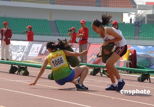 十月二十八日,女子30米搬重物赛跑中,重庆女选手朱跃(左)跑错道并撞倒湖北女选手郭静(右),所幸有惊无险,二人均完成赛程。中新社发 郑祚声 摄