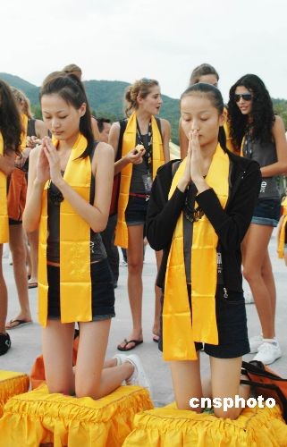 图为佳丽们在佛教文化浓厚的三亚南山文化旅游区内108米高的南海观音前拜观音。中新社发 尹海明 摄