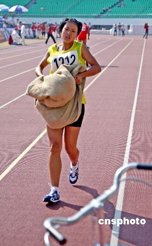 图为女子60米抢收粮食进仓比赛中选手装粮回跑。