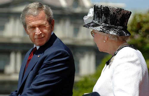 2007年5月,英国女王伊丽莎白二世访问美国时,布什总统与英女王在白宫出席媒体见面会。会上,布什扭过头,做了个怪相。作者:旺仔