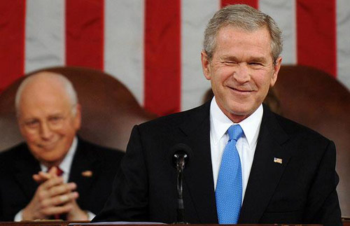 布什在国会山发表最后一次国情咨文讲话前,向台下的一位观众挤眼睛。作者:旺仔