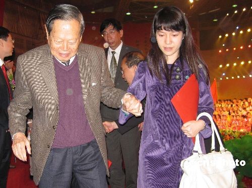 11月1日,在西南联大在昆建校70周年在会上,杨振宁夫妇甫一出现,立刻成为媒体关注的焦点。面对频闪不断的镁光灯,杨振宁夫妇面带微笑,极为配合。大会结束后,在翁帆的搀扶下,杨振宁走下主席台。中新社发 刘子倩 摄