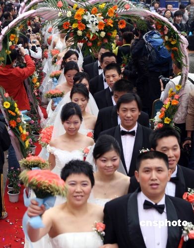 11月2日,重庆农民工日,重庆市为当地农民工举行集体婚礼,30对进城务工青年在众多市民见证下结为连理。从2007年开始,重庆市将每年11月的第一个星期日设为“重庆农民工日”,以纪念农民工对该市社会和经济发展所做的贡献。中新社发 郭晋嘉 摄