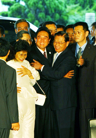 大陆海协会会长陈云林(右三)三日率协商代表团来台,进入台北圆山饭店后,与海基会董事长江丙坤(右二)热情拥抱。