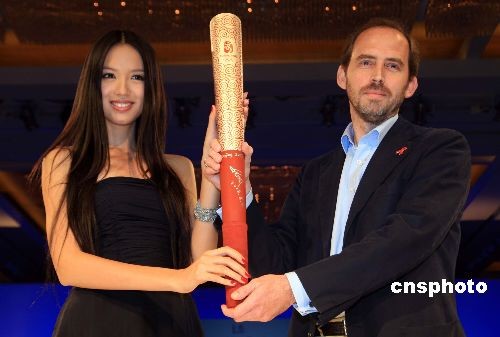 11月3日晚,一场预防性病艾滋病慈善拍卖晚会在上海举行,中国“小巨人”姚明签名的北京奥运火炬,经过激烈竞拍,以10万元人民币被一位外籍爱心人士拍得,捐赠给中国预防性病艾滋病基金会,图为2007年“世界小姐”张梓琳亲手向爱心人士呈上姚明签名的“奥运火炬”。