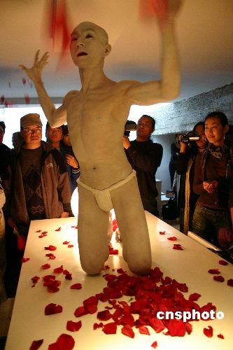 11月2日下午,马来西亚的华裔舞者李瑞强在北京鼓楼东大街的一家酒吧为大家表演现代舞“人与神”。中新社发 郭海鹏 摄