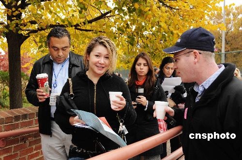 在临近华盛顿的弗吉尼亚阿灵顿郡中心图书馆投票站,很多选民因为起得早,没有吃早饭,此时来了两位送饼干和热咖啡的。可是,这两位开口就问:你是奥巴马的投票者么?一位女士说“Yes!”,于是马上咖啡饼干免费奉上。中新社发 邱江波 摄