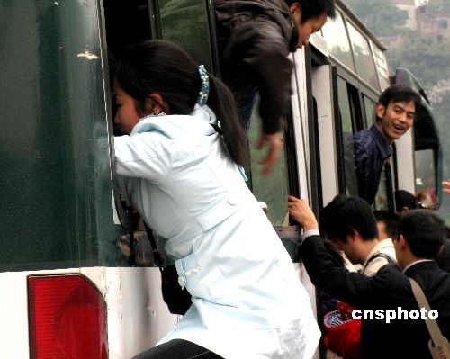 重庆主城区出租车罢运事件11月4日上午仍在持续,但从重庆市出租汽车协会了解到,截止4日下午16点30分,重庆主城区共有4000多辆出租车上路营运,占全市主城区出租车数量的一半,持续到4日上午的罢运事件出现良好转机,但仍严重影响市民出行,在南坪区出现了部分市民为了赶车回家攀爬公交车的情景。中新社发 许康平 摄